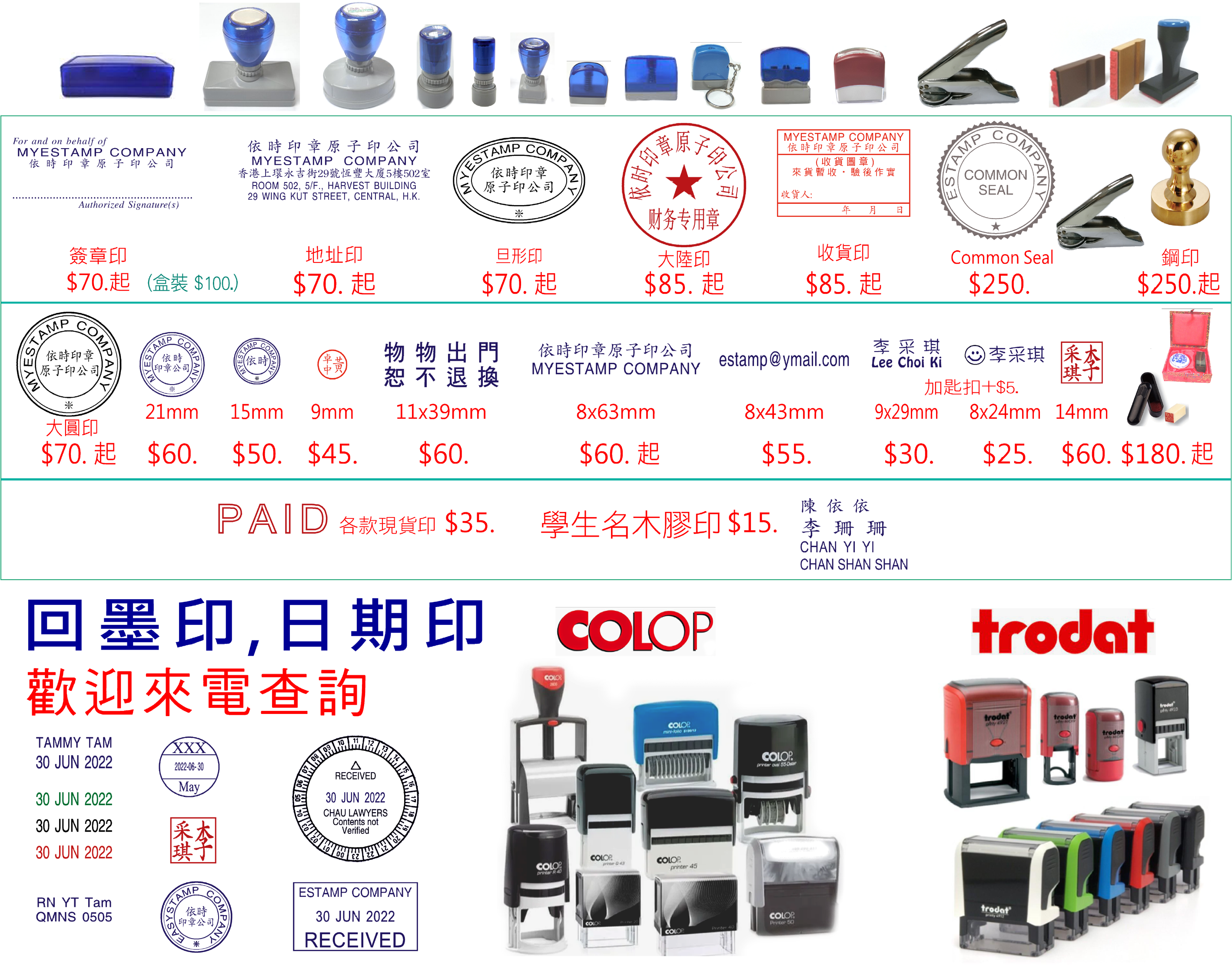 公司原子印章、回墨印章、COMMON SEAL、鋼印維修、日期印章、瑩光印、火漆印、原子印墨水、瑩光印油光敏印章、膠印